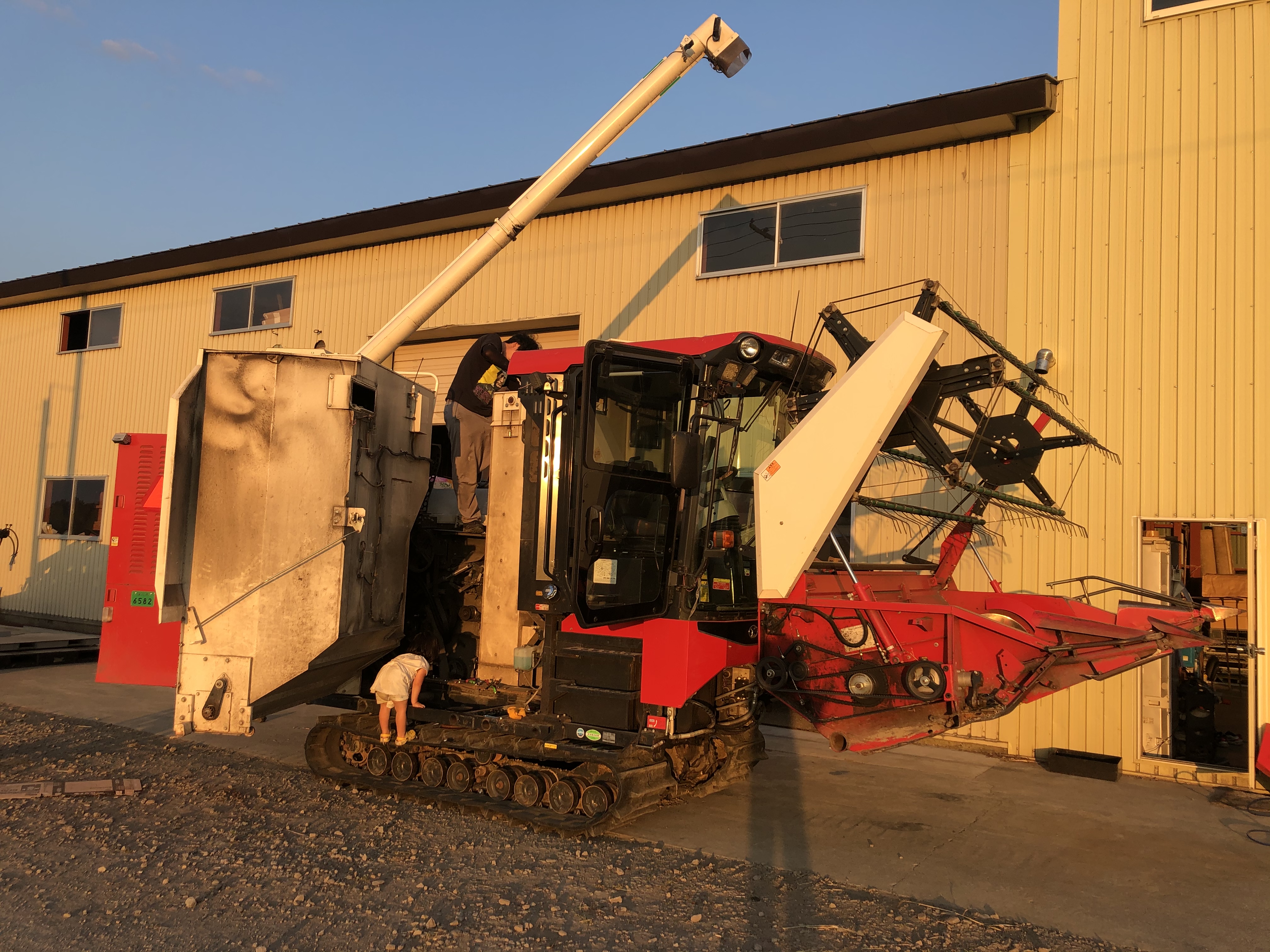 写真はコンバインと言って、お米を刈り取る機械で、整備中の様子です。お米の他にも蕎麦や小麦も刈り取りできます。